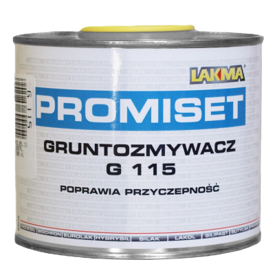 PROMISET™ GRUNTOZMYWACZ G115 UV jest preparatem czyszczącym i poprawiającym przyczepność silikonów do wielu materiałów, min.: szkła, anodyzowanego aluminium, stali nierdzewnej, niektórych tworzyw sztucznych i powierzchni porowatych. Zaobserwowano również polepszenie adhezji do powierzchni lakierowanych niektórymi farbami proszkowymi pozbawionymi wosków.