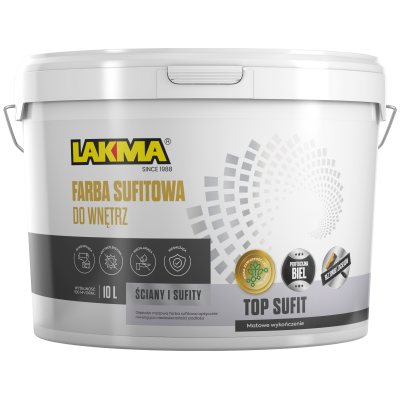 TOP SUFIT to wysokiej jakości, wodna farba akrylowa przeznaczona do malowania sufitów wewnątrz pomieszczeń. Farba tworzy jednolitą, głęboko matową powłokę, eliminującą refleksy świetlne i optycznie niwelującą nierówności podłoża. Dzięki dobrej sile krycia i właściwej lepkości, zapewnia łatwą aplikację, nie chlapie podczas malowania i minimalizuje ryzyko smug oraz łączeń pasów. Zastosowanie niskoemisyjnych surowców sprawia, że produkt spełnia normy dotyczące niskiej emisji LZO.
